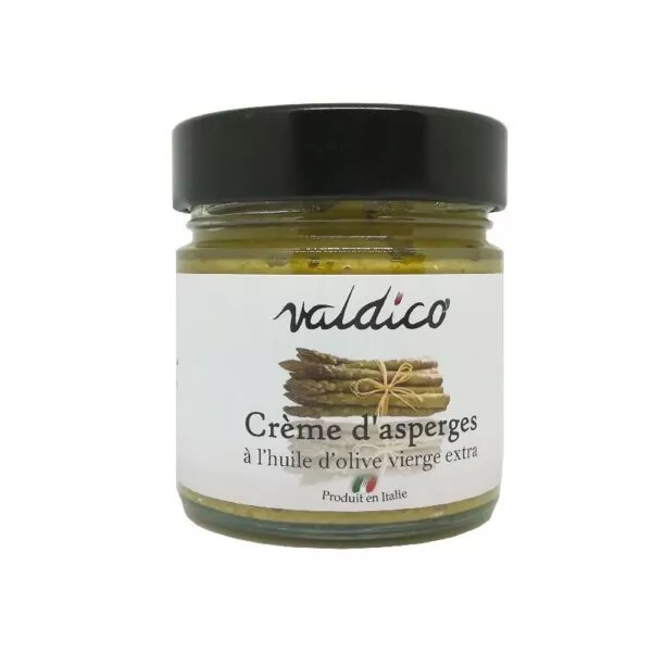 De belles asperges vertes (79 %) préparées à l’huile d’olive vierge extra (20 %) donnent à cette crème son onctuosité et une saveur toute douce à peine corsée par une toute petite pointe de piment et un peu de vinaigre de vin pour en relever la saveur.